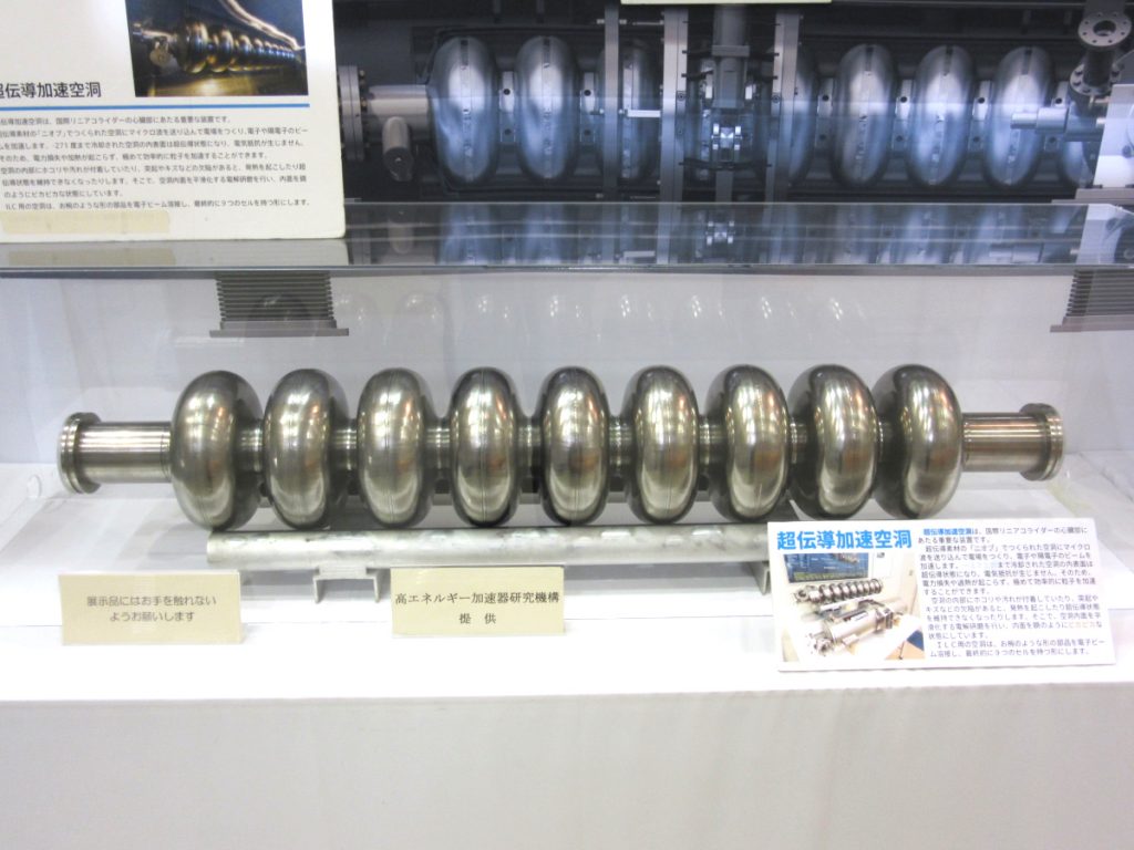 最初に展示室に入って一番に目を引くのがこの大きな黄色い筒のようなものです。これはクライオモジュールと呼ばれるもので、この中にニオブという物質で作られたバームクーヘンのような形の筒、超伝導加速空洞など様々な装置を組み合わせてILCが作られていきます。この筒は最終的には約20キロの長さまでつなげられ、この中で宇宙の始まりを解き明かすかもしれない実験が行われるのです。
