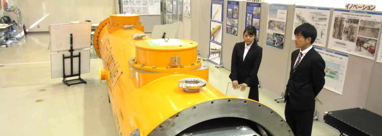 After you enter the room, the first thing to catch your eye will definitely be this large orange tube. This is called a cryomodule, and within is placed another tube-like object (resembling a baumkuchen cake) made out of a material called niobium. This superconductive cavity is one of the devices put together to make up the ILC. These tubes will be placed together in a line that could reach up to around 20 km long, and within, they’ll conduct experiments that might uncover the secrets behind the origins of the universe.