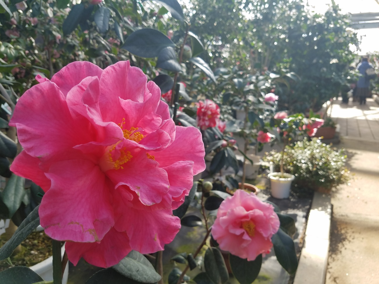 Various different camellias being sold at the camellia museum. If you find a favorite camellia at the museum, out of the over 500 types grown inside, you might just be able to buy your own pot of it to take home.