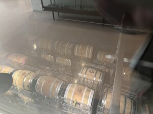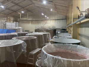 ここは大きなステンレスの醸造タンクが何個も並ぶ醗酵室。今回訪問した3つのワイナリーの中で一番大きな醗酵室でした。この1つのタンクから約7,000本のワインができるそうです。醗酵室の外にも、ワインができあがる前の独特な香りが漂っていました。