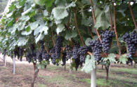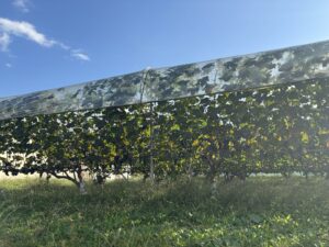 <Grapevines spread out all around the winery, covered neatly with plastic to prevent disease from mold>