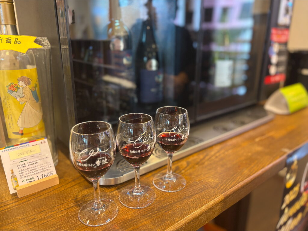 店内では試飲も充実しています。無料で約10種類、有料でも6種類のワインが1杯100円で楽しめます。まずいただいたのは、紫波ワインの代表格「レプリゼント紫波」。フレッシュですっきりした辛口白ワインで、自園自醸の覚悟を感じる凛とした味わいでした。続いての「シャルドネ樽熟成」は、白ながらしっかりした樽のボディ感があり、こってりした料理にも合いそうな深みがありました。